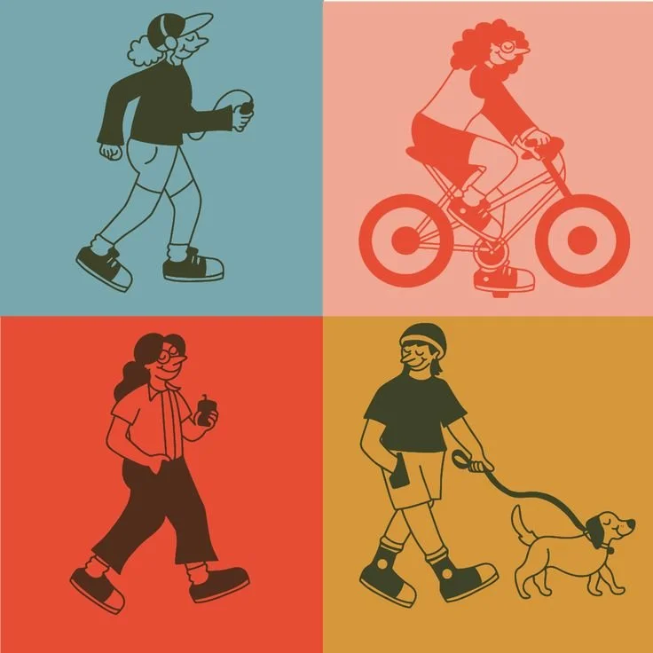 The visual system combines playful illustration and retro-inspired typography, creating a warm and welcoming aesthetic that celebrates movement and togetherness. From cozy sweatshirts to digital promotion, the brand captures the simple joy of slowing down and taking a stroll with friends.